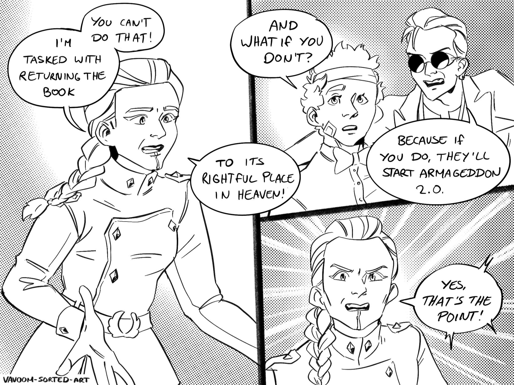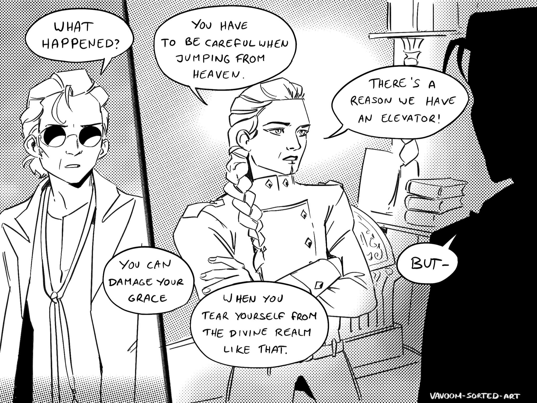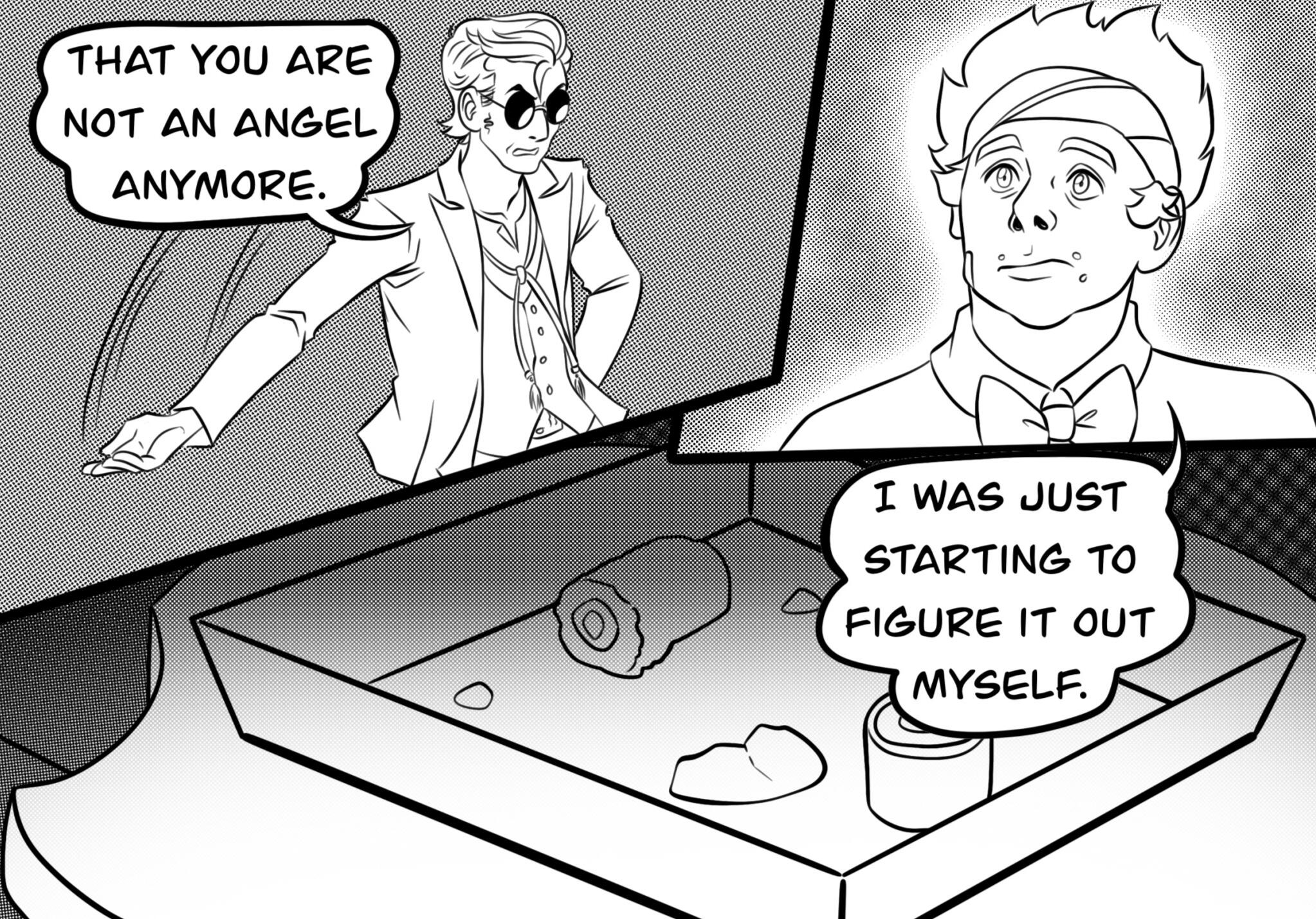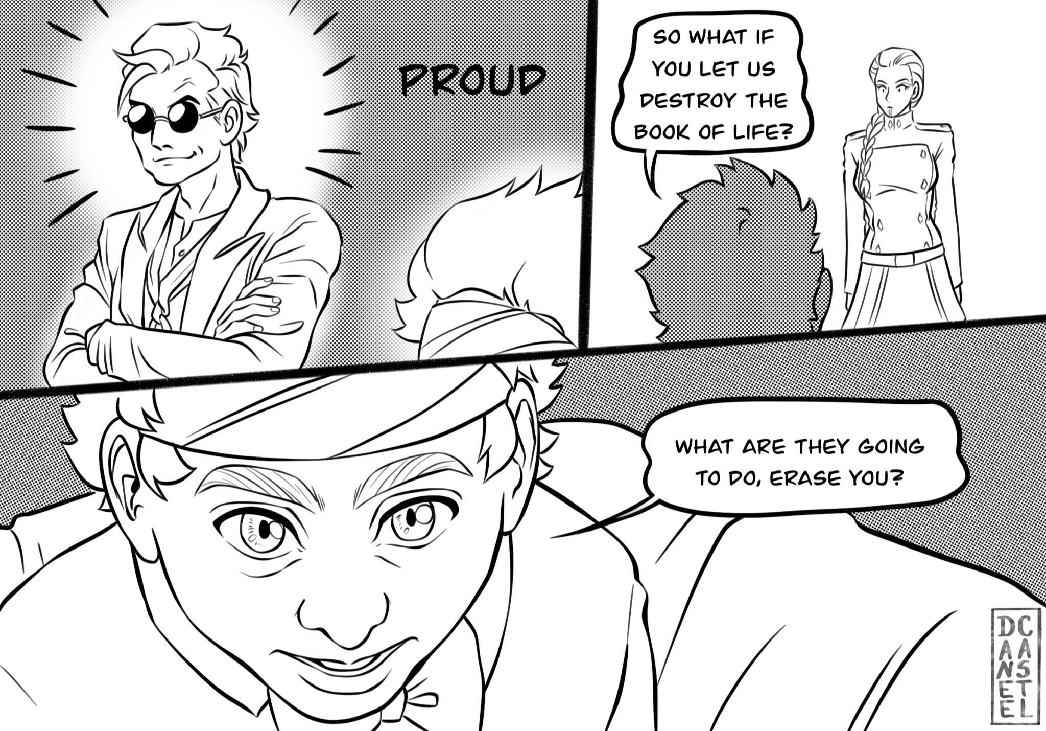 astrobleme [ as-truh-bleem ] - an erosional scar on the earth's surface, produced by the impact of a cosmic body, such as a meteorite.A Good Omens collab comic between Daneecastle and Zoey Time.Posted every Sunday(Zoey Time) and Wednesday(Danee).Posted on: